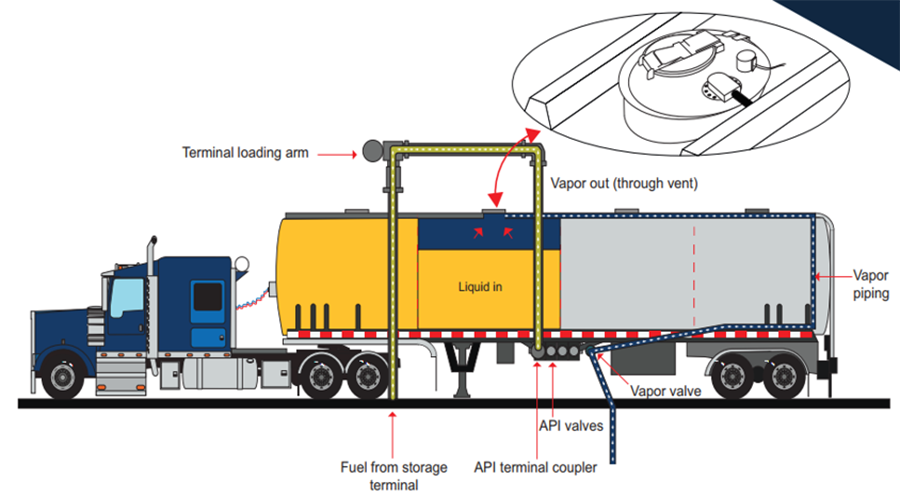 - Bảo vệ môi trường (Thu hồi hơi): Trước đây, hơi xăng dầu thường thoát ra khí quyển trong quá trình nạp và xả. Nhập đáy đã tạo điều kiện cho một hệ thống thu hồi hơi vượt trội. Hơi xăng dầu được thu hồi từ bồn chứa ngầm tại trạm xăng và chuyển đến kho để xử lý. Quá trình này, gọi là "thu hồi hơi giai đoạn 1" (stage 1 vapor recovery), giúp ngăn chặn ô nhiễm không khí và tái chế nhiên liệu.